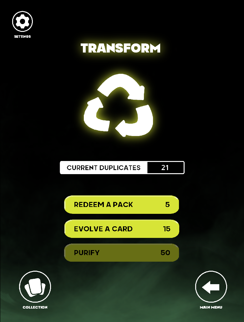 - Transform cards by recycling duplicates into new packs, card evolutions, and even purifying the trashy Skremplets into their cleaner forms!